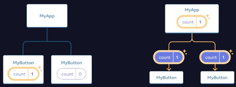 import { useState } from 'react' function Button({ scount, sonClick }) { return ( <div> <button onClick={sonClick}>点击</button> {scount} </div> ) } function App() { // 按钮内的功能提升到父组件,通过父子通信实现状态提升 const [count, setCount] = useState(0) const handleClick = () => { setCount(count + 1) } return ( <> <div>Default Template</div> <Button scount={count} sonClick={handleClick} /> <Button scount={count} sonClick={handleClick} /> </> ) } export default App默认与状态提升后的状态图: